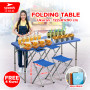 Dengan ketinggian 55 cm, meja ini sangat cocok digunakan untuk aktivitas duduk santai di rumah atau sebagai meja kerja. Pada ketinggian 75 cm, meja ini menjadi pilihan ideal untuk jualan di pasar atau bazar. Untuk kegiatan luar ruangan seperti camping atau piknik, meja ini dapat disesuaikan hingga ketinggian 90 cm, memberikan kenyamanan dan kemudahan. Meja ini juga dilengkapi dengan lubang penyangga yang dapat digunakan untuk memasang payung, memberikan perlindungan dari sinar matahari ketika digunakan di luar ruangan.